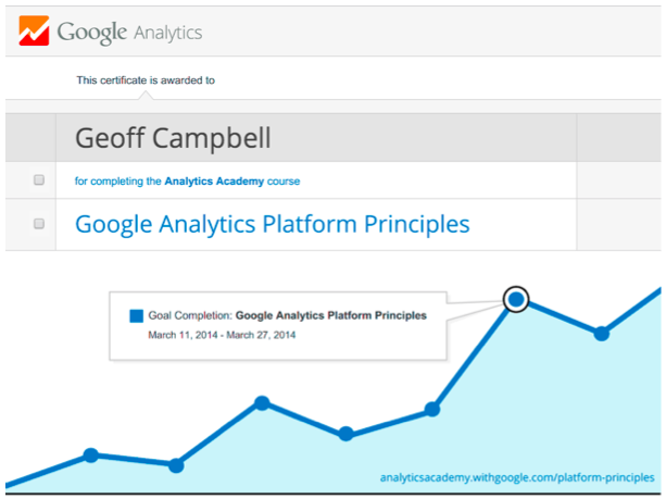 In an effort to improve my knowledge of web analytics I reviewed Google Analytics Academy’s first course, Digital Analytics Fundamentals, and took and passed the final evaluation for Google Analytics Platform Principles, the more advanced follow-up course. Below is my certificate from the course.