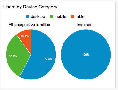 In the graph below, (if it were useful data and not something I finagled into what I wanted for this example, given that a high percentage of our target audience accesses our site on mobile and tablet devices, and I might recommend front-end or other changes so that more prospective families complete an inquiry. Before doing so, I’d make sure to look at things like behavior flow, the mobile and tablet goal abandonment numbers/rates, and different segments (including prospective families who have already inquired) to see the whole picture (or, more accurately, the most important parts of the picture).