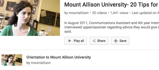 Four years ago I was completing a project I had been working on all summer – brainstorming ideas, scripting questions, location scouting, casting, and interviewing compelling characters for a video series at Mount Allison University. I had just completed my first social media audit (sorry, it’s cover only because the full report has some proprietary information), and wanted to put my recommendations into actions. With some general oversight (and videography done by a co-worker), I went about helping to create a video series for incoming students in hopes of reducing summer melt by quelling their fears and answering some of their questions without them having to ask. We made a total of 20 videos and shared them over the month of August.